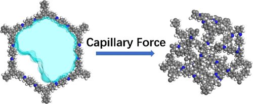 二维共价有机框架(2D COFs)是一类由共价键连接的结晶性多孔聚合物,具有可设计的纳米通道和可调控的功能,广泛应用于电化学能源、膜分离、水处理、催化等领域。当2D COFs处于液体环境中,纳米通道内会不可避免地产生毛细力。这种毛细力可能导致孔径、比表面积和晶体结构的变化,从而改变2D COFs的功能特性。因此,理解毛细作用力及其在2D COF纳米通道内的影响至关重要,但目前该领域的研究较为有限。